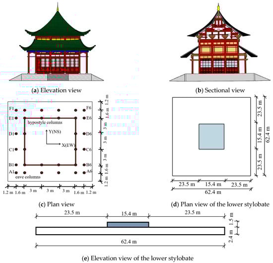 In recent years, the influence of the lower stylobate on the dynamic characteristics and seismic responses of wooden structures has become a research hotspot among scholars [22,23,24]. According to Yingzao Fashi, the traditional lower stylobate is composed of rammed earth with various heights and shapes. Research on the influence of different lower stylobates on the upper wooden structure is performed with different methods. Recent studies have shown that the dynamic characteristics of the upper wooden structure are changed due to the participation of the lower stylobate in the common vibration. Furthermore, the lower stylobate enlarges the seismic response of the upper wooden structure, which is not conducive to the seismic resistance of structures. Moreover, in the existing research on ancient buildings with lower stylobates, the upper wooden structures are mostly single-eave buildings, and there is relatively little research on double-eave ancient buildings. Therefore, the lower stylobate must also be considered in the model calculations [25,26]. However, the current research only focuses on the significant effects of the lower stylobate on the dynamic characteristics and seismic responses of the upper timber structure, and it fails to clarify the change rules of the peak displacement response, peak shear force, dynamic magnification factor, and other parameters of the upper timber structure when the lower stylobate exists. It is not possible to quantitatively reflect the energy dissipation capacity and vibration isolation performance of the structure.