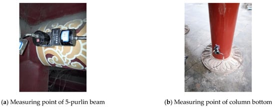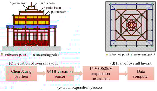 To obtain the dynamic characteristics and evaluate the seismic performance of the Chen Xiang Pavilion, the INV3062S/V network distributed acquisition instrument and the 941B ultra-low-frequency vibration sensor were used in the in situ dynamic test. The speed gear of the 941B vibration sensor was selected to collect vibration response signals based on ambient vibration when considering the size, quality, and material of the structure. According to the “Technical Code for Preventing Industrial Vibration of Ancient Buildings” (GB/T 50452-2008) [27], two horizontal vibration sensors were arranged at each measuring point to collect vibration response signals in the north–south direction (NS) and east–west direction (EW), respectively. Meanwhile, owing to the litter of the 941B vibration sensors, the test was conducted in batches, with the vibration sensors fixed as the reference point at the ground and three purlins. The vibration sensors were arranged at the foot and top of the corner columns. The layout of the measuring points is shown in Figure 3a. Both ends of the 5-purlin beam and the 9-purlin beam were chosen as the main measuring points due to the small height difference between the 7-purlin beam and the 9-purlin beam. The vibration sensor arrangement in the beam frame is shown in Figure 3b. The layouts of the measurement points for the overall structure are shown in Figure 3c,d. Through the INV3062S/V network distributed acquisition instrument, the data collected by the vibration sensor were transmitted to the data acquisition computer. The vibration sensor, data acquisition instrument, and computer were connected to receive signals, as shown in Figure 3e.