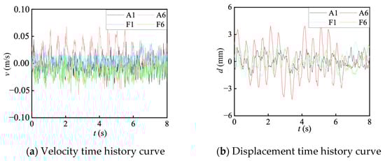 During the test, the sampling frequency and time were, respectively, set to 102.4 Hz and 200 s. The start mode was configured to be freely triggered. After the settings were completed, the sampling began when the waveform was stable. In Figure 4, Figure 4a is the signal waveform collected by the velocity sensor in the EW direction at the top of the eave columns, where v is the velocity at the top of the eave columns. The time history curve of the displacement d was obtained by integration, as shown in Figure 4b. A1, A6, F1, and F6 were corner columns, where the responses of the measuring points under the excitation were huge, as shown in Figure 2c.