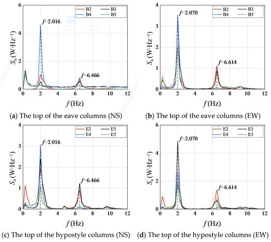 To reduce the interference of alternating current and noise, frequencies that were about four times greater than the highest analysis frequency were filtered out by a low-pass filter to avoid frequency aliasing. Meanwhile, the spectrum line number of the FFT was taken as 4096, and the Hanning window was selected. The phase spectrum and coherence function obtained from the cross-power spectrum analysis were evaluated to exclude spurious modes. If the phase value of a wave peak was at the degrees of 0 or 180 nearby and the coherence coefficient reached more than 90%, the frequency corresponding to the wave peak could be judged to be the natural frequency. Figure 5 shows the auto-power spectrum curves of the measuring points at the top of the hypostyle column, as well as the cross-power spectrum curves, coherence function curve, and phase spectrum curves between the measurement points at the top of the hypostyle column and the inactive reference point in the 3-purlin beam. Here, Sa stands for the power spectral density, and f stands for the frequency. B2, B3, B4, and B5 are hypostyle columns. The natural frequencies of the structure were obtained by auto-cross power spectrum analysis. The average values of 2.016 Hz and 6.466 Hz were regarded as the first and second natural frequencies in the NS direction, while 2.070 Hz and 6.614 Hz were the values in the EW direction, as shown in Table 1.