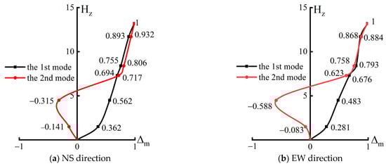 Taking the average vibration response value of the 3-purlin beam as a reference, the ratio of the mean vibration response values of the top and foot of the column, 9-purlin beam, and 5-purlin beam and that of the 3-purlin beam was used to determine the vibration mode coefficient of the structure. The displacement symbol was related to the orientation of the sensor. East and north were regarded as positive directions. As shown in Figure 6, the first and second vibration modes of the structure were translation motions. The first vibration modes of the NS and EW directions revealed that the overall structure was translated in the horizontal direction. The second vibration modes of the NS and EW directions showed that the eave columns swung in the opposite direction relative to the whole. Hz is the height of the measuring point, and Δm is the mode coefficient. Comparing the translation modes in the EW and NS directions, it can be found that the pattern is basically the same in both directions, and, for the first mode, the mode coefficients increase with increasing height; for the second mode, the coefficients all mutate at the height of the top of the outer eave column, which suggests that these columns sway inversely in both directions. The mode coefficients in the NS direction are slightly larger than the values in the EW direction.