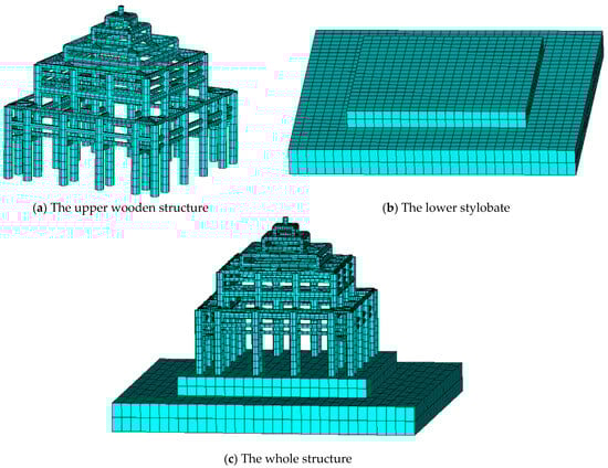 As shown in Figure 7, three finite element models were established through ANSYS to perform the dynamic characteristic analysis. As for the upper wooden structure, the column frame layer consisted of eave and hypostyle columns, which were connected by architraves, Pingban–Fang, and penetrating ties with different section sizes. Rectangular wooden doors and windows were installed around these. The beam frame layer included purlin beams, short posts, corner beams, and straining beams. The dimensions of the main wooden structural members are shown in Table 2. The material properties are shown in Table 3 [28,29], and the wood density was 346 kg/m3. Therefore, the BEAM188 linear finite strain beam element was adopted to simulate these wooden components, as shown in Figure 7a. BEAM188 is a 3D linear finite-strain beam element that is suitable for the analysis of slender to moderately slender members and capable of simulating the effects of bending, shear, and torsion deformation. The pyramid roof with blue-glazed tile cover comprised wooden purlins, rafters, watch bricks, and tubular tiles, which acted on the tops of the hypostyle columns and short posts in the form of a concentrated mass through the MASS21 unit. Mortise–tenon and Dougong brackets were simulated by the COMBIN39 spring element, and the spring stiffness coefficients were obtained through the calculation model in the literature [30,31,32], as shown in Table 4 and Table 5. There were two overlapping end nodes at the intersection of each beam and column. Six COMBIN39 spring elements with zero length and no coupling were set between the two to simulate the mortise–tenon joints with 6 degrees of freedom. The column base constraint condition was hinged because the columns were simply placed on top of the plinth [33]. In the actual structure, the timber column foot floats on the top of the foundation stone, there is no fixed constraint, and it only relies on horizontal friction to transfer the seismic shear force. The lower stylobate is a “Xumizuo” stylobate with two layers, mainly composed of rammed earth and covered with cement blocks of 500 mm × 500 mm × 50 mm on the surface; this was simulated by SOLID45 with eight nodes, as shown in Figure 7b. When establishing the whole structure, the partial size of the first base was taken, and the first floor was fixedly connected to the ground, as shown in Figure 7c. The specific parameter values of the lower stylobate material are shown in Table 6.