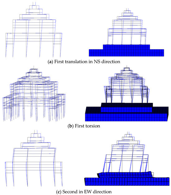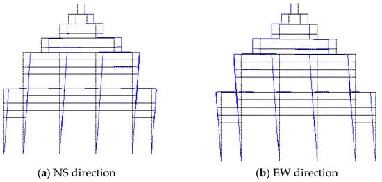 The modal participation mass coefficient was adopted to measure the contribution of each vibration mode to the response of the structure, and those of the upper wood structure and the whole structure were calculated, respectively. As shown in Table 8, the modal participation mass coefficient of the upper wooden structure of the first two orders is 0.918 in each direction, which indicates that the first two-order vibration modes of the calculation models contribute significantly. Table 9 shows the modal participation mass coefficient of the whole structure. It shows that the first three vibration modes in the NS direction of the whole structure contribute little to the response, while the modal participation mass coefficient of the fourth vibration mode is 0.8951, and the contribution of the first four vibration modes to the response reaches 92.45%. However, the modal participation mass coefficient of the first four modes in the EW direction is minimal, and that of the fifth mode is 0.8951. The contribution of the first five modes to the response is up to 92.78%. When considering the common work of the lower stylobate, the first five-order vibration modes contribute significantly to the response for the whole structure, and the lower stylobate vibrates from the fourth order.