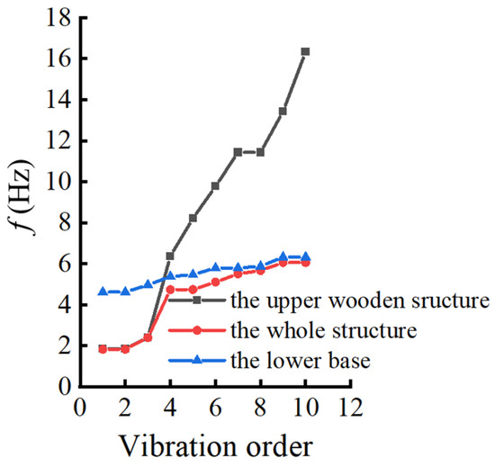 As shown in Figure 9, the natural frequencies of the upper wooden structure increase rapidly, especially after the third order. The frequency variation ranges from 1.860 Hz to 16.329 Hz and it is relatively scattered. As for the lower stylobate, the first ten-order natural frequencies vary little as a whole, with a range of 4.613 Hz to 6.320 Hz, which reveals that they are relatively stable. The reason is that, as an important part of the ancient architecture, the lower stylobate has a heavy structure, large volume, and relatively stable physical characteristics. This makes the frequency distribution of the lower stylobate more dense, and the adjacent frequencies are similar, showing stable vibration characteristics. The first ten-order natural frequencies of the whole structure relative to the upper wooden structure are smaller, ranging between 1.821 and 6.054 Hz. The changing amplitude is significantly smaller than that of the upper wooden structure, indicating that the lower stylobate reduces the frequencies of the whole structure. Meanwhile, the first three-order natural frequencies of the whole structure are similar to those of the upper wooden structure, which shows that the lower stylobate does not participate in vibration with the whole structure. Starting from the fourth order, the natural frequencies of the whole structure are close to those of the lower stylobate, which indicates that the lower stylobate begins to participate in the common vibration of the upper wooden structure. This is mainly because the lower stylobate has a great mass and stiffness, which have a significant impact on the vibration characteristics of the whole structure. The above conclusions are consistent with the research results in references [22,23,24], which confirms the reliability of the research conclusions obtained in this work.