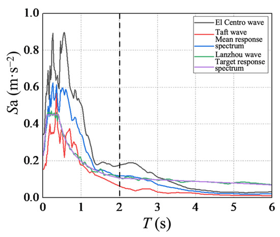 The Chen Xiang Pavilion is located in the eight-degree seismic fortification zone with the designated basic seismic acceleration value of 0.2 g. The site category is classified as II, and the designated earthquake group is the second group. In terms of the “Code for Seismic Design of Buildings” (GB 50011-2010) [34], the El Centro wave, Taft wave, and Lanzhou artificial wave, suitable for class II sites, were selected as structural seismic excitations. A comparison between the seismic response spectrum and design response spectrum is shown in Figure 11, where Sa represents the spectral acceleration, and T represents the natural vibration period of the structure. Furthermore, amplitude modulation was carried out based on the seismic intensity. The peak accelerations were adjusted to 70 cm/s2 (frequent earthquake), 200 cm/s2 (fortification earthquake), and 400 cm/s2 (rare earthquake). Considering that the peak seismic accelerations occurred in the first 20 s, the time history records of the first 20 s of the three seismic waves were chosen as the seismic wave input [35,36].