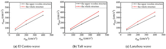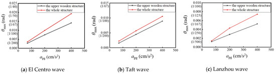 Seismic waves of different peak accelerations apg were applied to the upper wooden structure and whole structure models. Then, the influence of the lower stylobate on the seismic response of the Chen Xiang Pavilion was analyzed. Since the Chen Xiang Pavilion is symmetrical and the layout is regular, the X axis was the main excitation direction selected for the seismic wave input. At the same time, taking the top of the hypostyle column as the research object, the maximum displacement response Δmax, the maximum acceleration response amax, and the maximum inter-structural layer drift angle θmax in different working conditions were obtained, as shown in Table 10. Here, θmax is obtained by dividing the maximum displacement response Δmax of the hypostyle column top by the column height.