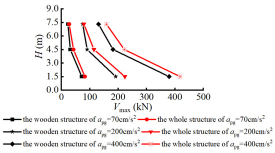 As seen from Table 12 and Figure 14, the maximum shear force of the layer in the upper wooden structure and the whole structure decreases gradually from top to bottom under the different seismic wave conditions. With an increment in the seismic excitation intensity, the maximum shear force of the layer in the two models also increases. Moreover, it is concluded that the maximum shear force of the layer in the whole structure model is greater than that in the wooden structure model. This shows that the lower stylobate magnifies the maximum shear force of the layer in the upper wooden structure and affects the lateral resistance of the structure.