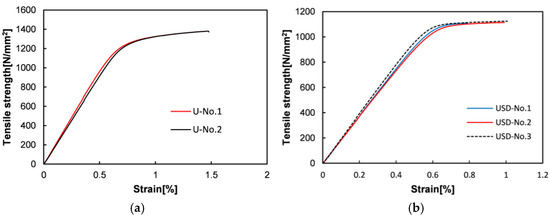 In this study, two types of ultra-high-strength rebars were used as longitudinal reinforcements in the columns: SBPDN1275/1420 with surface spiral grooves and SBPDN1080/1230 (ultra-high-strength deformed (USD) rebars), as illustrated in Figure 2. The SBPDN1275/1420 rebars (S: steel, B: bar, P: prestressed concrete, D: deformed, and N: no need to consider relaxation) were utilized in one of the specimens. These rebars feature spiral grooves on their surface, are characterized by low bond strength and ultra-high tensile strength, and have a diameter of 12.6 mm. Specimens using SBPDN1275/1420 bars were designated as U-columns, while those using USD rebars and unbonded USD rebars were termed SB and SBD columns, respectively. The transverse reinforcements for the columns also employed SBPDN1275/1420 rebars with a smaller diameter of 7.1 mm. For the U-columns, composite stirrups consisting of four unidirectional ties arranged in two directions were used (see Figure 1a). The stirrup spacing was set at 35 mm to maintain the same stirrup ratio as in the other columns. The yield strength and yield strain of the SBPDN1275/1420 rebars were determined using the 0.2%-offset method, yielding values of 1289 N/mm2 and 0.0085, respectively. In comparison, the yield strength and yield strain of the SBPDN1080/1230 rebars were 1105.93 N/mm2 and 0.0078, respectively. According to the literature [26], the bond stress values for the two types of high-strength rebars embedded in 40 MPa concrete were approximately 3.0 N/mm2 and 15.0 N/mm2, respectively.