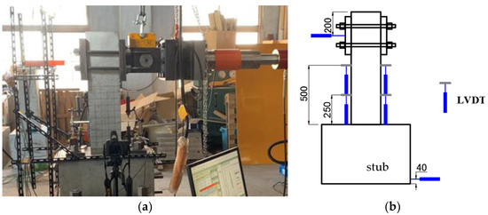 The columns were anchored to a force stub to ensure a rigid connection, closely replicating realistic conditions under which structural elements might operate. The loading setup for the cantilever column specimens was strategically designed to simulate the contra-flexure point in frame columns, where antisymmetric bending typically occurs during seismic events. To replicate the lateral seismic forces acting on the top floors of a frame, a reversed lateral load was applied at the top of the columns, positioned 750 mm above the top surface of the stub. This study focuses on the structural performance of columns without axial forces for several reasons. First, the deterioration performance of columns is examined without axial force effects, which are already well documented. Second, the study targets column elements in the upper portions of RC frame structures, where axial forces are relatively small. Finally, as an exploratory verification experiment, this study excludes axial forces, which will be addressed in subsequent research. The experimental setup is illustrated in Figure 3. It includes a 1000 kN hydraulic jack anchored within a robust steel frame, designed to apply lateral forces in both positive and negative directions. The hydraulic jack was fixed in position to ensure consistent application of lateral forces throughout the tests. The drift ratio R was calculated by dividing the relative lateral displacement between the stub and the loading height from the stub (shear span length).