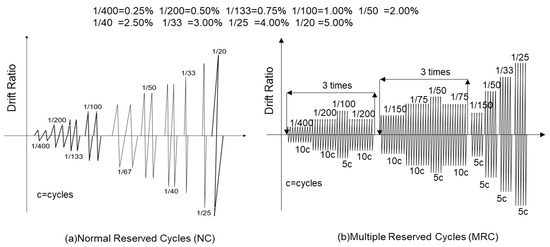 Regarding the loading methods, Figure 4 illustrates two distinct loading protocols employed in the experiments: the normal reversed cyclic (NC) load and MRC loads. For the NC loading method, the drift targets of the loading cycles were set at drift ratios R = 0.25%, 0.50%, 0.75%, 1.0%, 2.0%, 2.5%, 3.0%, 4.0%, 5.0% rad, respectively. Each loading cycle was performed twice before extending the drift ratio of 3.0%, after which only one cycle was performed for each subsequent drift ratio. Regarding the MRC load protocol, it was divided into three distinct stages: the elastic stage, the plastic stage, and the ultimate stage. The sequence and repetition of the first two stages were informed by seismic response analyses of a 43-story prototype RC building subjected to two simulated seismic motions designed for long-period ground motion and the Building Center of Japan’s simulated wave [28]. Each stage comprised a series of loading cycles: 10 cycles of small-amplitude deformations, followed by 10 cycles of medium-amplitude deformations, and concluding with 5 cycles of large-amplitude loads. The elastic stage was designed based on the assumption that the maximum inter-story drift ratio would not exceed 1/100, a parameter representative of the structure’s response to exceptionally rare seismic events. This stage involved three repetitions of the loading sequence, resulting in a total of 105 load cycles. Following the elastic stage, the experiment progressed to the plastic stage, which also consisted of three iterations, each comprising 105 cycles with the same loading pattern as the elastic stage. In the ultimate load phase, displacement ratios of 1/33 and 1/25 were applied in five repetitions, contingent upon the structural integrity of the specimens. This phase aimed to evaluate the residual elasticity of the structure and its capacity to endure large seismic forces.