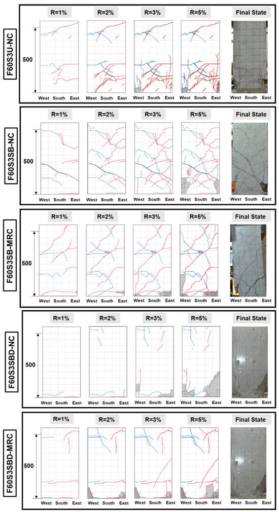 However, beyond this threshold, a proliferation of developmental cracks transitioned into flexure-shear types. Regarding the specimens F60S3SB-NC and F60S3SB-MRC, it was observed that the number of cracks in the F60S3SB-NC specimen exceeded those in the F60S3SB-MRC specimen, applicable to both pull and push directions. However, the cracks in specimens subjected to the MRC loading method were longer than those in specimens subjected to NC loading. Moreover, crack formation was predominantly observed within a zone extending from 0 mm to 500 mm from the stub of the specimens. The initial spalling of concrete in the F60S3SB-MRC specimen was recorded at a drift ratio of 1%. Additionally, in the case of F60S3SB-NC, concrete spalling was observed at larger deformations, indicating a variance in the structural response to different loading schemes.