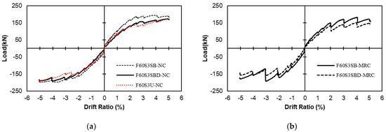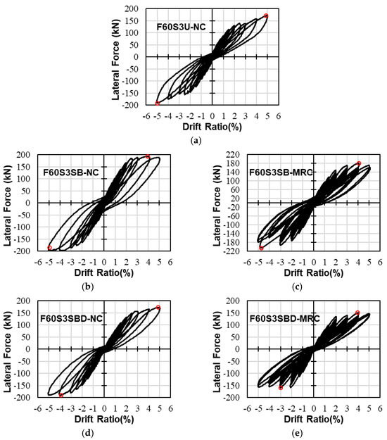 According to Figure 7, for the specimens reinforced with USD ultra-high-strength steel rebars SBPDN1080/1230, the lateral force and initial stiffness were comparable before reaching a drift ratio of 1% on the positive side. Regardless of the direction, positive or negative, the maximum lateral force approximated 200 kN, as shown in F60S3SB-NC and F60S3SB-MRC. In the case of specimens reinforced with unbonded SBPDN1080/1230 rebars, the lateral forces were nearly identical between drift ratios of 2% and −2%. However, beyond the drift ratio of 2%, the lateral force exhibited by specimens under MRC loading was relatively lower, which may be due to the accumulation of internal damage and external concrete failure depending on the applied loading conditions.