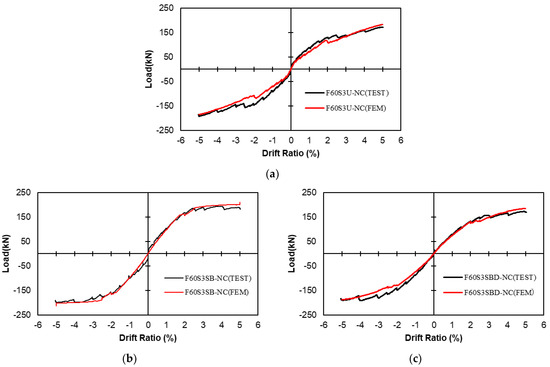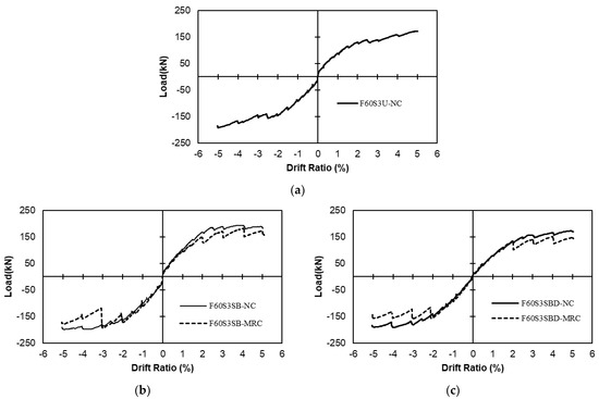 Skeleton curves of the specimens: (a) F60S3U-NC; (b) comparison between F60S3SB-NC and F60S3SB-MRC; (c) comparison between F60S3SBD-NC and F60S3SBD-MRC.