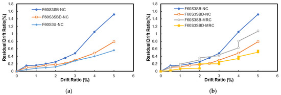 Residual drift ratios of the specimens: (a) specimens reinforced by different rebars; (b) specimens reinforced by USD and unbonded USD rebars.