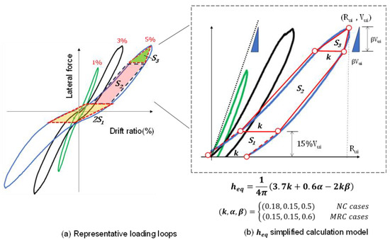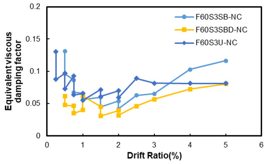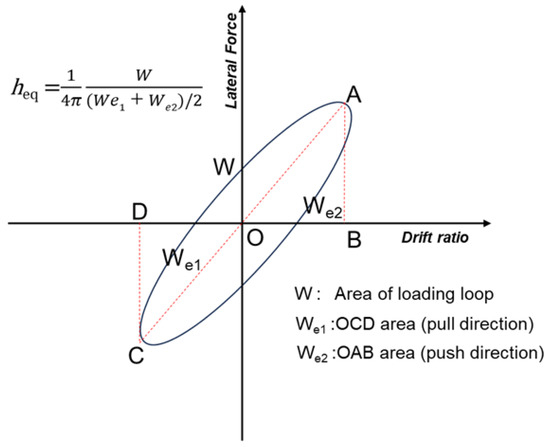 In this section, the equivalent viscous damping coefficient (heq), which is calculated by the method [29], as shown in Figure 10, is employed to evaluate the energy dissipation capacity of the specimens. As presented in Figure 11, it is observed that the specimen reinforced with unbonded USD ultra-high-strength rebars exhibits the lowest equivalent viscous damping coefficients throughout the entire testing process. Before the drift ratio of 3.5%, the U series specimens demonstrate the highest energy dissipation coefficient. After that, however, the increase rate in heq of the U series decreases, whereas it continues to rise for the other two types of specimens.