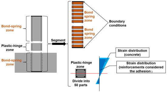 The convergence calculations for the stress of the reinforcement are then executed, grounded on the end boundary conditions. On the other hand, the plastic hinge zone aimed to conduct a hybrid finite element analysis containing a bond-spring analysis and a moment-curvature (M-f) analysis. As shown in Figure 12, the cross-section is divided into 50 fiber layers in the lateral direction. The cover concrete is divided into 50 parts, while the core concrete confined by stirrups is divided into 40 parts. In the analysis of the hinge zone, the curvature f is given, and the concrete strain of each element is determined by assuming that the section center axial strain ε0 holds the concrete cross-section retention assumption. The strain on the reinforcing bars is the value found in the bond-spring area. The stress of each element is determined from the strain determined above and the assumed stress–strain relationship, and the axial force and bending moment acting on the cross-section are determined.