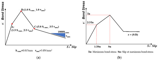 Bond–slip models of steel bars: (a) Funato et al.’s model for U-steel bars [26]; (b) Shima et al.’s model for USD bars [33].