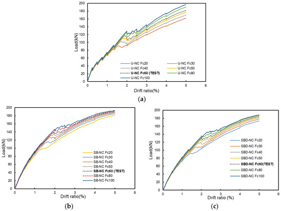 The compressive strength of concrete significantly impacts the load-bearing capacity of columns, as shown in Figure 17, including U series, SB series, and SBD series specimens with an identical shear span ratio. The concrete strength of the specimens in the tests was 60.1 N/mm2. To explore the impact of varying concrete strengths, a range from 20 N/mm2 to 100 N/mm2 was selected. According to Figure 17, the discrepancy in elastic stiffness between the tests and simulations is minimal, particularly before reaching a drift ratio of 1%. According to previous experimental results, the steel bars in both columns did not yield before large deformation, but the concrete began to be crushed, which showed that the resistance capacity of the steel bars was not exerted, hurting the increasing loading resistance of the columns. Therefore, theoretically, changes in the compressive strength of concrete will have a profound impact on the ultimate load-bearing capacity of the columns with high-strength steel bars, especially steel bars.