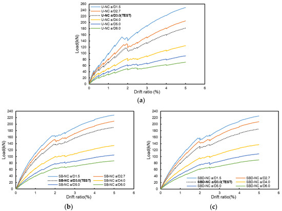 Effects of the shear span ratios (a/D): (a) specimens reinforced with low-bond ultra-high-strength rebars (U series); (b) specimens reinforced with ultra-high-strength USD rebars (SB series); (c) specimens reinforced with unbonded ultra-high-strength USD rebars (SBD series).