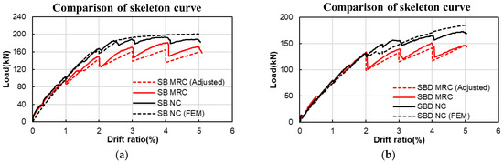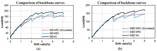 Since the U series specimen is limited, only SB and SBD specimens were discussed here. Because the values of the MRC series data points at the x-axis (drift ratio) position may not be perfectly aligned, an interpolation method was employed to conduct a comparative analysis of the bearing capacity of the NC series and MRC series specimens. Subsequently, the next step is to quantify the difference in the y-axis (load) between the NC specimens and the MRC specimens at the same drift rate, again using the interpolation method.