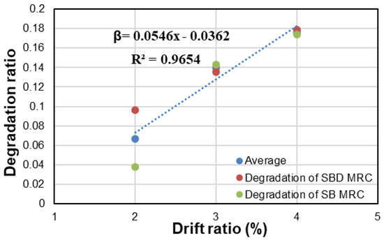 Compared to MRC and NRC specimens, it was found that not only cycle frequency affects the degradation rate, but also the increase in drift rate in the MRC loading. Therefore, the degradation ratios corresponding to the target drift ratios of 2%, 3%, and 4% between the first and fifth cycles were analyzed further. As shown in Figure 21, the relationship between the drift rate and the average degradation ratios of SB and SBD specimens can be quantified by