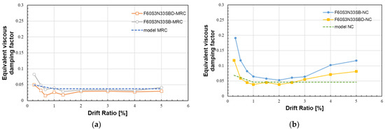 Figure 24 shows the equivalent viscous damping coefficient values calculated using the proposed model. The calculated values for the specimens with the MRC loading are slightly higher than the experimental values, but they are still closely evaluated. On the contrary, the calculated values for the specimens using the NC loading are lower than the obtained experimental results. The calculated values are close to the experimental data for MRC specimens, indicating that the model is on the right path but needs improvement to accurately predict the results of different loading methods.