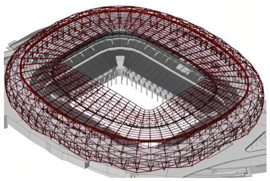 According to the requirements of architectural shape, space function, and visual aesthetics, the canopy inside the stadium roof structure adopts an annular spoke-type cable bearing-grid structure. The three-dimensional axonometric of the stadium is shown in Figure 3. The cable-rod system is composed of radial cables, annular ring cables, and struts. The radial cables are arranged in a straight line, with a total of 56 pieces, and projected into a ring. The weight of the upper mesh is balanced by applying prestressing in the radial and annular cables. Sectional and material parameters of members are listed in Table 2.