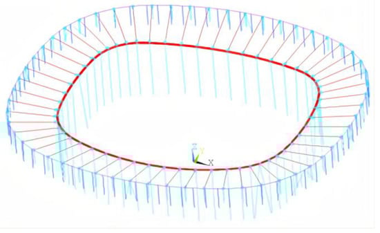The length error analysis of the ring beam and cable system is carried out in ANSYS V12.1 software. The model includes the following components: structural columns (excluding cross braces between columns), additional supports between columns, support frame of the ring beam, external pressure ring beam, radial cables, annular ring cables, and struts. The ANSYS model is shown in Figure 4.