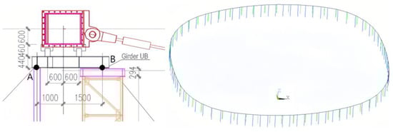 During the construction of the structure, to prevent torsion and overturning of the outer pressure ring beam when the cable net is lifted, and to facilitate the construction of the workers, a supporting frame is installed under the ring beam at the tension end of each radial cable. The support frame is established according to the stiffness parameters provided by the design, and the element type adopts LINK10 (compression only). The cross-section of the support frame is square. According to the stress state, the support points of the support frame are mainly divided into inner (B) and outer (A) parts in the radial direction, as shown in Figure 5.