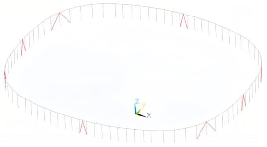 Due to the weak hoop stiffness of the peripheral structure (structural column, cross braces, external pressure ring beam), the state of hoop instability is easy to trigger during the construction process. Therefore, it is necessary to add additional cross braces between the structural columns to enhance the hoop stiffness of the structure. Due to the different column spacing, the length of diagonal braces vary from 15 m to 18 m. The tentative cross-section is a round steel pipe, which is 355.6 mm in diameter and 6 mm in thickness. The element type of the diagonal brace is set as LINK8 (axial force element), and the specific modeling diagram is shown in Figure 6.