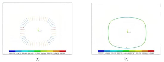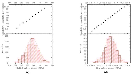 After analyzing 1000 random samples, it can be seen from Figure 9 that the absolute value of the cable force error ratio of the radial cable is 0.568%, and the absolute value of the cable force error ratio of the ring cable is 5.774%. If the ring cable length error is the only influence factor, the cable force error of the ring cable is larger than that of the radial cable, while the maximum error ratio is also at a low level.