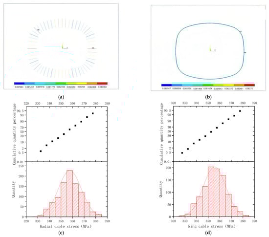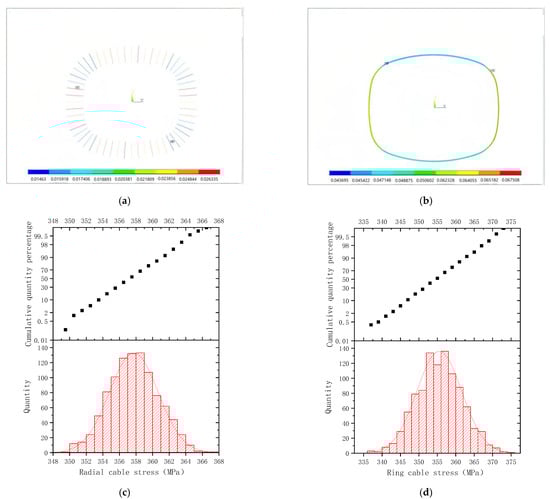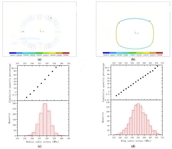 Error effect diagram of Combination 6#. (a) Distribution of absolute value of radial cable force error ratio, (b) Distribution of the absolute value of the ring cable force error ratio, (c) Radial cable stress distribution (MPa), (d) Stress distribution of ring cable (MPa).