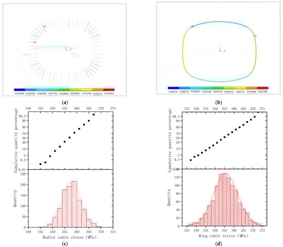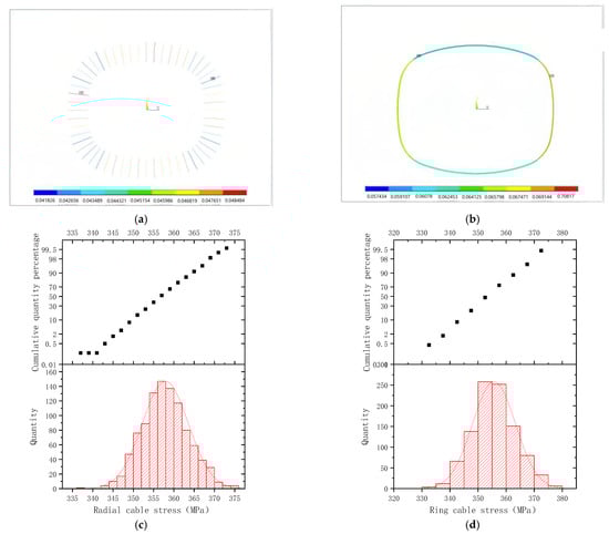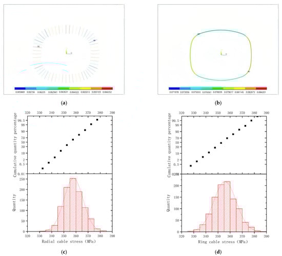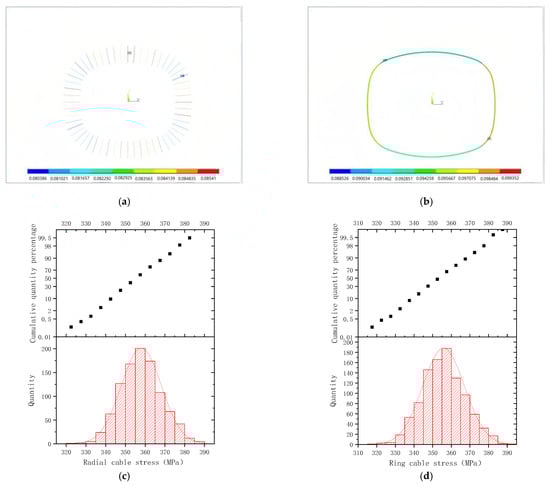 Error Effect Plot of Error Combination 8#. (a) Distribution of absolute value of radial cable force error ratio, (b) Distribution of the absolute value of the ring cable force error ratio, (c) Radial cable stress distribution, (d) Stress distribution of ring cable.