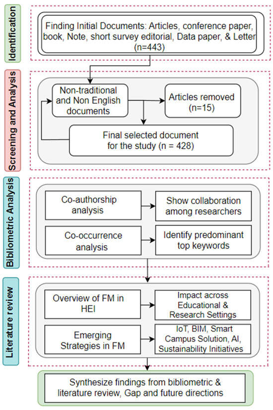 The initial step of the methodology involved developing the necessary search string to locate publications related to FM in higher education. The keywords “facilities management”, “higher education” and “universities” were selected for the search string. The search string (“Facilities Management” AND “Higher Education” OR “University”) was subsequently executed in the Scopus™ search query. The selected analysis period was from 1991 to 2021, and the purpose was to critically examine the research background and scientific developments in the research field over 30 years. The query returned 443 documents comprising articles, conference papers, book chapters, reviews, conference reviews, books, notes, short surveys, and letters.
