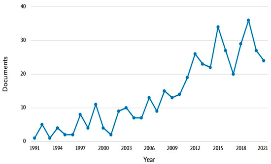 Figure 4 shows that the number of publications in research fields increased from 1 document in 1991 to 36 in 2019, although this number declined to 27 and 24 in 2020 and 2021, respectively. The analysis revealed that an average of 14.45 documents were published annually between 1991 and 2021 in the subject area. The increasing number of publications indicates a significant social impact in the research area, which could drive future scientific advancements. Global trends such as the COVID-19 pandemic, climate change, and global warming could lead to increased research in this area, indicating a promising future for this field. This view is based on growing concerns about indoor air quality and its impact on the health and safety of building occupants due to the COVID-19 lockdowns and quarantine policies.