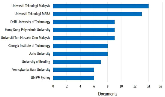 The results show that Malaysian researchers (including Awang, Kamaruzzaman, Sapri, Sipan, and Ali) are the most prolific in FM research, accounting for 50% of the top 10 globally. To further examine the role of Malaysia and its academics in the research field, the affiliations and countries where the researchers are based were reviewed in detail. Figure 6 and Figure 7 display the top 10 affiliations and countries analyzing FM in higher education from 1991 to 2021. The top affiliations for the research field are largely Malaysian (Universiti Teknologi Malaysia, Universiti Teknologi Mara, and Universiti Tun Hussein Onn Malaysia), although Delft University of Technology (The Netherlands) and Hong Kong Polytechnic University (China) also feature prominently. This study reveals that Universiti Teknologi Malaysia and Universiti Teknologi Mara are the top institutions with over 10 published documents, whereas the remaining institutions have 9 or fewer.
