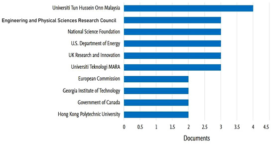Malaysia is among the top five countries globally conducting research on FM, following the United States and the United Kingdom. The most prolific countries in terms of the number of publications are the United States, the United Kingdom, and Malaysia, with 134, 45, and 40 publications, respectively. Other notable research destinations in the subject area are Canada, Germany, and Australia, which have fewer than 30 publications. In contrast, Nigeria occupied the last position among the top 10 countries and produced 11 documents in total from 1991 to 2021. The high publication rate among top authors, affiliations, and countries could be due to factors ranging from national interests, research policies, and financial support, among others. Figure 8 presents the top 10 organizations that offer funding research activities in the subject area of FM in higher education worldwide.