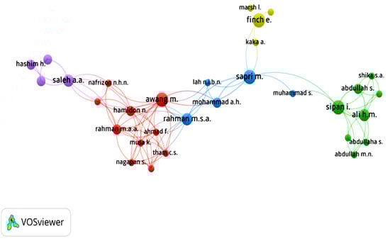 The analysis of co-authorship was performed on the basis of the number of publications on the topic retrieved from Scopus via VOSviewer. Figure 9 presents the visualization map and network of researchers in the subject area over the period examined in this study. The analysis was based on a minimum of one publication (n = 1, resulting in 1045 authors) using the weighted documents as the required scale of visualization of the data. The findings revealed that 31 authors and five clusters were identified during the co-authorship analysis. The largest cluster (red), with 10 nodes, was the most interconnected, with notable researchers such as M. Awang (Malaysia), followed by the green cluster, which had notable researchers such as I. A. Sipan and H. M. Ali (Malaysia). The blue cluster was identified as a crucial link between the red, green, and yellow clusters, indicating high collaboration between regional and global actors. This observation also accounts for the high output among researchers and the dominance of Malaysia in the subject area globally. The cluster analysis revealed that M. sapiens, a collaborator and researcher at Universiti Teknologi Malaysia, is the most influential on the topic.