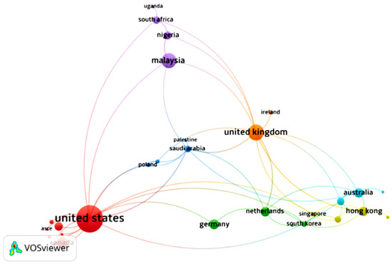 Figure 10 presents a network visualization of research output across nations on the topic. The data analysis utilized a minimum of one document, resulting in 60 countries meeting the requirement of using weighted documents as the visualization scale. The most prominent nodes (in decreasing order) are the United States, the United Kingdom, and Malaysia, which is in good agreement with the findings in Figure 7. The US has significant global collaboration with countries such as Canada, Germany, Saudi Arabia, Poland, Malaysia, Republic of Korea, and South Africa, highlighting its global impact on the subject area. On the other hand, the UK maintains strong connections with countries such as Ireland, Malaysia, Nigeria, the Netherlands, and Australia, possibly due to their historical ties.