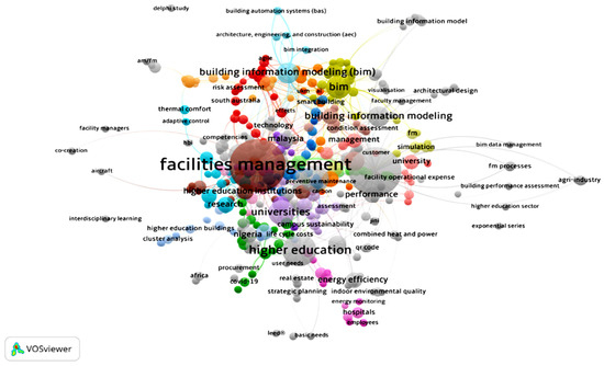 The co-occurrence analysis seeks to examine the relationships between related keywords in the subject area of FM in higher education. In this study, the co-occurrence analysis is limited to the co-authorship and co-occurrence analyses of the top researchers, publication documents, organizations, and countries on the topic on the basis of Scopus data from 1991 to 2021. This study was based on the single (n = 1) occurrence of a keyword, which resulted in 1121 keywords that fulfilled the criteria for analysis. Figure 11 presents the network visualization of the co-occurring keywords related to FM in higher education. The most recurring keywords are “facilities management”, “higher education”, and “universities”, which is expected because of the search string used in this study. However, other notable keywords include “building information modeling”, “energy efficiency”, “performance”, “thermal comfort”, and “campus sustainability”.