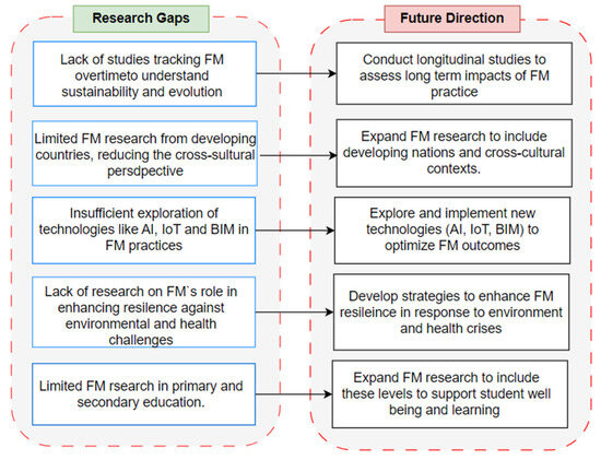 Despite the outlined developments, several gaps and areas exist for future research. Figure 12 depicts and summarizes the various possible research gaps and areas for future research on FM in higher education studies. First, longitudinal studies are needed to understand the long-term effects of FM practices on academic success and institutional performance. Current studies are primarily cross-sectional and lack insights into the evolution and sustainability of FM improvements over time [9]. FM research is conducted predominantly in developed countries such as the United Kingdom and the United States, which signals a significant dearth of studies from developing nations. Therefore, cross-cultural studies on FM in HEIs are needed. Cross-cultural studies can provide thorough perceptions of the varying influences of FM practices across separate socioeconomic backgrounds.