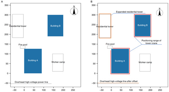 The project includes two structures: Building A, with a height of 24 m and ground dimensions of 90 by 126 m split across four floors, and Building B, which reaches a height of 14 m and features ground dimensions of 80 by 110 m over two floors. In addition to these structures, the surrounding area features a 30-story residential tower, a worker’s camp, a high-voltage power line, and a fire pool. The layout adopts a planar coordinate system with the southwest corner of Building A as its origin, and the project overview is illustrated in Figure 2A.
