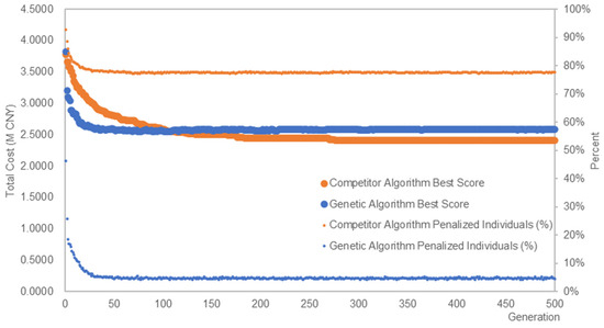 The genetic algorithm converges significantly faster than the competitor algorithm. This could be attributed to the competitor algorithm’s method of independent random exploration by all individuals, making them more susceptible to penalties, with the proportion of penalized individuals converging to 78%. In contrast, the genetic algorithm uses high-performing individuals to crossbreed and generate new pairs, reducing their susceptibility to penalties, and leading to a lower proportion of penalized individuals converging to just 5%. However, this mechanism also makes the genetic algorithm prone to local optima.