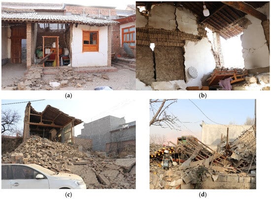 The civil structures in the high-seismic-intensity zone of the Jishishan Mw 6.2 earthquake mainly included adobe houses and beaten-cob constructions. The rural buildings were constructed more than 20 years ago, and most of them were used as storage rooms, kitchens, miscellaneous rooms, and other auxiliary rooms; however, a small amount were lived in by the elderly. Most of the civil structures destroyed or severely damaged in the earthquake were adobe masonry walls. The roofs were pent roofs or span roofs, which are made of wood and tiles, and the front wall was decorated with bricks. These were self-built by villagers, and no anti-seismic structural measures were set up.