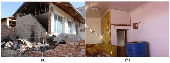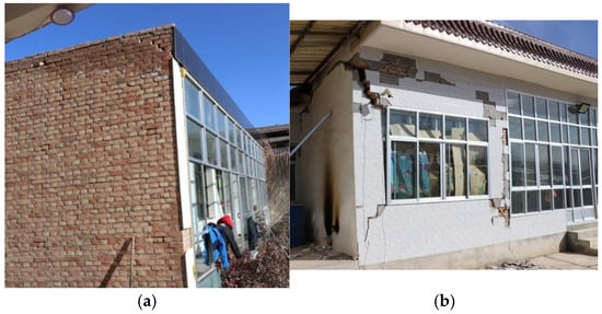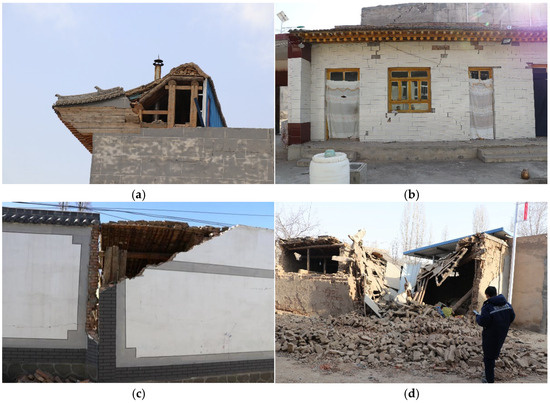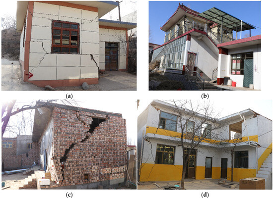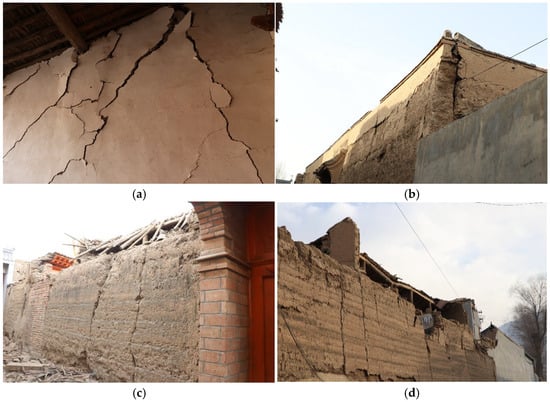 - The seismic damage to civil structures and brick–wood structures was similar. In general, these two structures accounted for 70–80% of the residential buildings, which were self-built by the residents. Generally, no seismic structural measures were set up, and the wooden roofs were mostly made of hard-ridge beams with an on-wall construction style. The architectural forms of the adobe civil structures were more complex. Mixed load-bearing walls of the wooden column/brick column–adobe walls and mixed load-bearing walls with the lower half being rammed earth walls and the upper half being adobe walls were more common. Therefore, the seismic damage to adobe civil structures was more serious than that to rammed-earth civil structures. The older residential buildings were mainly severely damaged and destroyed. The main seismic damage was wall-penetrating cross-cracks, the local collapse of load-bearing walls, the collapse of gables, or overall collapse. The residential buildings that were less than 15 years old were mainly moderately damaged and seriously damaged. The earthquake damage mainly included cracks under the purlin, roof falling, wall cracks, and local collapse of the load-bearing wall.