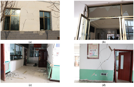 The main bearing bodies of brick–concrete structures was the masonry brick wall, which were characterized by precast slab or cast-in-place concrete roof, single or two floors, accounting for about 10~20% of the total number of houses in high-intensity areas. The construction date was mostly after 2010, most of them did not set ring beams or structural columns, they were generally decorated with tile veneer, and most of them were residential houses. Typical earthquake damage photos are shown in Figure 5. Figure 5a shows a new single-layer brick–concrete structure with a cast-in-place concrete roof. Under the action of the earthquake, due to stress concentration, the four corners of the doors and windows had penetrating cracks. Figure 5b shows a two-story brick structure: the ground floor was set up with a foundation ring beam and an upper ring beam, the four corners of the house were set up with structural columns, and the second floor had no structural columns or ring beams. Due to the excessive opening of the second-floor house and the insufficient support force of the only brick column, the second floor of the door and windows seriously cracked, the wall was almost completely crushed, and the damage was serious: the building could no longer be used. Figure 5c shows a new, brick, cast-in-place concrete floor slab, not yet occupied. Because the transverse wall was perpendicular to the direction of seismic shear wave propagation, the overall strength of the brick wall was insufficient, with penetrating cracks and localized slumps in the transverse walls, which were severely damaged. Figure 5d shows a new two-story brick–concrete structure. Due to the insufficient strength of the building wall, the lack seismic structural measures, and the insufficient connection between the roof and the wall, the bottom and the second-story walls were generally cracked. The second-story back wall collapsed, the prefabricated slab roof fell, and the whole house almost collapsed.