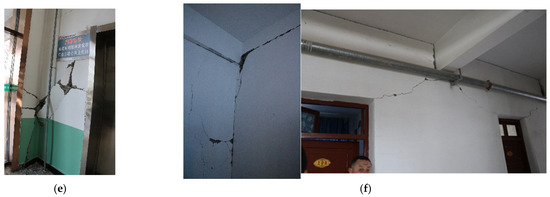 The number of frame structures throughout the high-intensity zone was low, basically limited three- to four-story schools, hospitals and very few two-story residential housing. Two-story residential housing was intact, with earthquake damage mainly occurring in the form of falling wall cladding and chandeliers, with damage to fences and other decorations. Figure 6 shows a photograph of typical earthquake damage to a hospital, built about 15 years prior. Figure 6a shows the prevalence of interwindow wall cracks in this frame structure, which developed in all the walls of floors 1–3. Figure 6b shows that the door frame of the entrance on the ground floor of the hospital was crushed and deformed, and the glass was broken and fell off. Figure 6c shows the bottom wall bulging, deformation, cracks, and wall skin drop. Figure 6d shows the earthquake damage including wall cracks, door frame extrusion deformation, and falling in the office wall of the hospital. Figure 6e,f show that cracks appeared at the connection of the bottom vertical and horizontal walls, cracks in the wall under the beam, and dislocations between the wall and the beam.