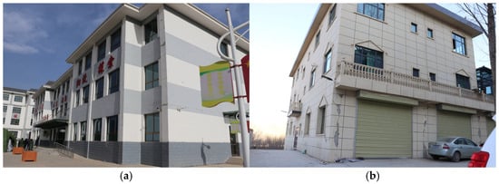 Photographs of typical earthquake damage to dwellings using anti-seismic construction measures. (a) Experimental middle school building. (b) Frame dwellings in Kexinmin Village.