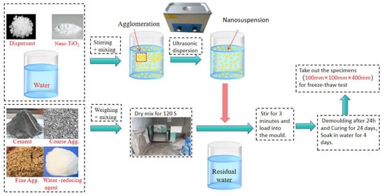 According to the JGJ 55-2011 specification for proportion design, nano-TiO2 substitution rates of 2%, 4%, and 6% were used to replace cement. The mix proportions are outlined in Table 3. The preparation process is illustrated in Figure 1. After 24 days of curing in a standard curing room (20 ± 2 °C, RH ≥ 95%), the specimens were immersed in fresh water for 4 days before undergoing an F–T test.