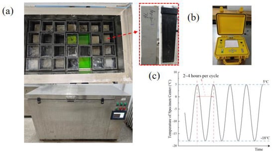 A fast F–T testing machine for concrete, produced by Shandong Luda Testing Instrument Co., Ltd. (illustrated in Figure 2a), was used to conduct the tests. The F–T cycle system is depicted in Figure 2c. After every 25 F–T cycles, another set of specimens measuring 100 mm × 100 mm × 400 mm was taken. The surface scum on these specimens was cleaned off, and moisture was removed using a cloth. The specimens were then inspected for visible damage, and their mass was recorded. Subsequently, the transverse fundamental frequencies of the specimens were measured using a dynamic elastic modulus tester, as shown in Figure 2b.